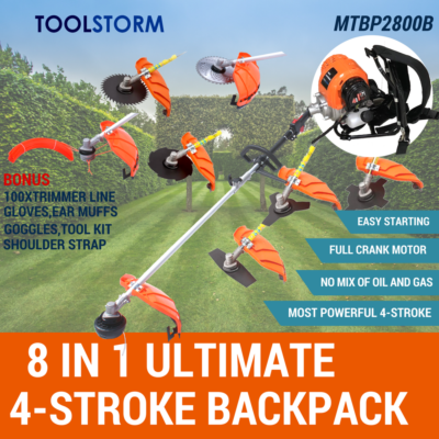 This item is with most powerful 4-STROKE BACKPACK engine in the market, with Japan design and management, it is the best 4-stroke motor. Loaded with no less than 8 attachments, including a tungsten tipped carbide alloy blade, the MTBP2800B Multi Pro-Series is the ultimate gardening machine. Features: -Comfy padded backpack & Anti-vibration system. -Class-leading power of 4-STROKE BACKPACK engine 40CC, with TOOLSTORM Easy Start System. -No mix oil and gas -Full crank engine, much smoother starting and running. -Patented direct-air-injection carburettor -Commercial grade quick connect couplings with no less than 8 attachments. -Twin line, Metal cap bump Feed, Easy Wind Spool just insert and twist. -Bonus accessory kit including protective goggle, gloves, earmuffs, toolkit. SPECIFICATIONS Manufacturer:TOOLSTORM Engine Type: Petrol EURO 2 - FOUR Stroke Commercial Dual Weighted Crank / Double Ringed Piston Displacement : 40CC Max. Engine Speed: 10,000 RPM w/Centrifugal clutch Fuel Tank Capacity: 650mm Fuel Mix: no mix oil and gas for 4 stroke motor. Fuel Type: Regular Unleaded 95 +RON IN THE BOX 1 x TOOLSTORM 4-STROKE motor(BACKPACK) 1 x Flexible Shaft 8 x Whipper Snipper / Brush Cutter(Easy load line trimmer head, alloy trimmer head, 2T,3T,4T,8T,40T,40 T TCT ) 100xTrimmer line BONUS ACCESSORY KIT (toolkit, goggle, gloves, ear muffs) PaymentWe accept payment via: Our bank details are: