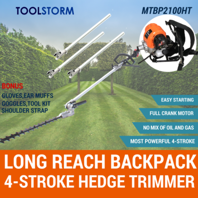 This item is with most powerful 4-STROKE engine in the market, with Japan design and management, it is the best 4-stroke motor. The MTBP2100HT Multi Pro-Series is the ultimate gardening machine. Features: -Comfy padded backpack & Anti-vibration system. -3 extension pole to tackle those branches hard to reach. -Class-leading power of 4-STROKE engine 40CC, with TOOLSTORM Easy Start System. -No mix oil and gas -Full crank engine, much smoother starting and running. -Patented direct-air-injection carburettor -Commercial grade quick connect couplings with hedge trimmer attachment. -Bonus accessory kit including protective goggle, gloves, earmuffs, toolkit. SPECIFICATIONS Manufacturer:TOOLSTORM Reach: 5.6 Metres (when held at hip height) Note: As weight increases with each extension, an assistant may be required beyond 3m. Engine Type: Petrol EURO 2 - FOUR Stroke Commercial Dual Weighted Crank / Double Ringed Piston Displacement : 40CC Max. Engine Speed: 10,000 RPM w/Centrifugal clutch Fuel Tank Capacity: 650mm Fuel Mix: no mix oil and gas for 4 stroke motor. Fuel Type: Regular Unleaded 95 +RON --HEDGE TRIMMER ATTACHMENT Gearbox Type: XH - Ball Bearing Commercial - Greasable Blade Length / Type: 450mm Dual Oscillating Blades Material: Ultra-Hardened Knife Steel Cutting Capacity: 450mm - max 15mm Diameter Degrees of Rotation: 270 - 12 incremental positions --EXTENSION SHAFTS Coupling type: Quick Spring Connect Shafts: Commercial Alloy 9 Splines External Diameter: 26mm Length: 80cm IN THE BOX 1 x TOOLSTORM 4-STROKE motor(BACKPACK) 1 x Flexible Shaft 1 x Hedge Trimmer Attachment 3 x Extension Shafts BONUS ACCESSORY KIT (toolkit, goggle, gloves, ear muffs) PaymentWe accept payment via: Our bank details are: