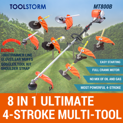 This item is with most powerful 4-STROKE engine in the market, with Japan design and management, it is the best 4-stroke motor. Loaded with no less than 8 attachments, including a tungsten tipped carbide alloy blade, the MT800B Multi Pro-Series is the ultimate gardening machine. Features: -Class-leading power of 4-STROKE engine 40CC, with TOOLSTORM Easy Start System. -No mix oil and gas -Full crank engine, much smoother starting and running. -Patented direct-air-injection carburettor -Commercial grade quick connect couplings with no less than 8 attachments. -Double shoulder strap. -Twin line, Metal cap bump Feed, Easy Wind Spool just insert and twist. -Bonus accessory kit including protective goggle, gloves, earmuffs, toolkit. SPECIFICATIONS Manufacturer:TOOLSTORM Engine Type: Petrol EURO 2 - FOUR Stroke Commercial Dual Weighted Crank / Double Ringed Piston Displacement : 40CC Max. Engine Speed: 10,000 RPM w/Centrifugal clutch Fuel Tank Capacity: 650mm Fuel Mix: no mix oil and gas for 4 stroke motor. Fuel Type: Regular Unleaded 95 +RON IN THE BOX 1 x TOOLSTORM 4-STROKE motor 8 x Whipper Snipper / Brush Cutter(line trimmer head, alloy trimmer head, 2T,3T,4T,8T,40T,40 T TCT ) 100xTrimmer line BONUS ACCESSORY KIT (toolkit, gloves, ear muffs, double shoulder strap) PaymentWe accept payment via: Our bank details are: