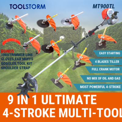 4-Stroke 9 in 1This item is with most powerful 4-STROKE engine in the market, with Japan design and management, it is the best 4-stroke motor. Loaded with no less than 9 attachments, including garden tiller, the MT900TL Multi Pro-Series is the ultimate gardening machine. Features: -Class-leading power of 4-STROKE engine 40CC, with TOOLSTORM Easy Start System. -No mix oil and gas -Full crank engine, much smoother starting and running. -Patented direct-air-injection carburettor -Commercial grade quick connect couplings with no less than 9 attachments. -Double shoulder strap. -Twin line, Metal cap bump Feed, Easy Wind Spool just insert and twist. -Bonus accessory kit including protective goggle, gloves, earmuffs, toolkit. SPECIFICATIONS Manufacturer:TOOLSTORM Engine Type: Petrol EURO 2 - FOUR Stroke Commercial Dual Weighted Crank / Double Ringed Piston Displacement : 40CC Max. Engine Speed: 10,000 RPM w/Centrifugal clutch Fuel Tank Capacity: 650mm Fuel Mix: no mix oil and gas for 4 stroke motor. Fuel Type: Regular Unleaded 95 +RON IN THE BOX 1 x TOOLSTORM 4-STROKE motor 1 x Tiller attachment 8 x Whipper Snipper / Brush Cutter(line trimmer head, alloy trimmer head, 2T,3T,4T,8T,40T,40 T TCT ) 100xTrimmer line BONUS ACCESSORY KIT (toolkit, gloves, ear muffs, double shoulder strap) PaymentWe accept payment via: Our bank details are: