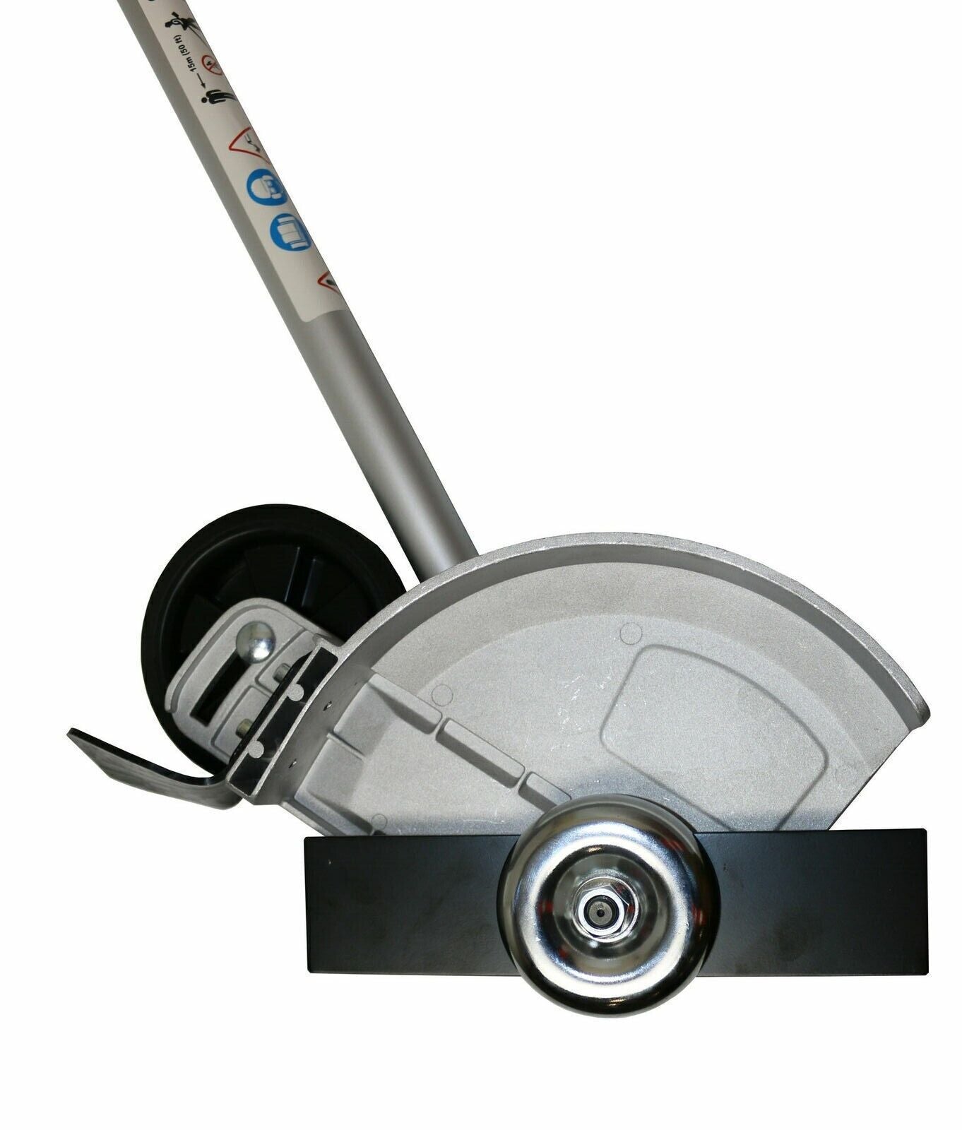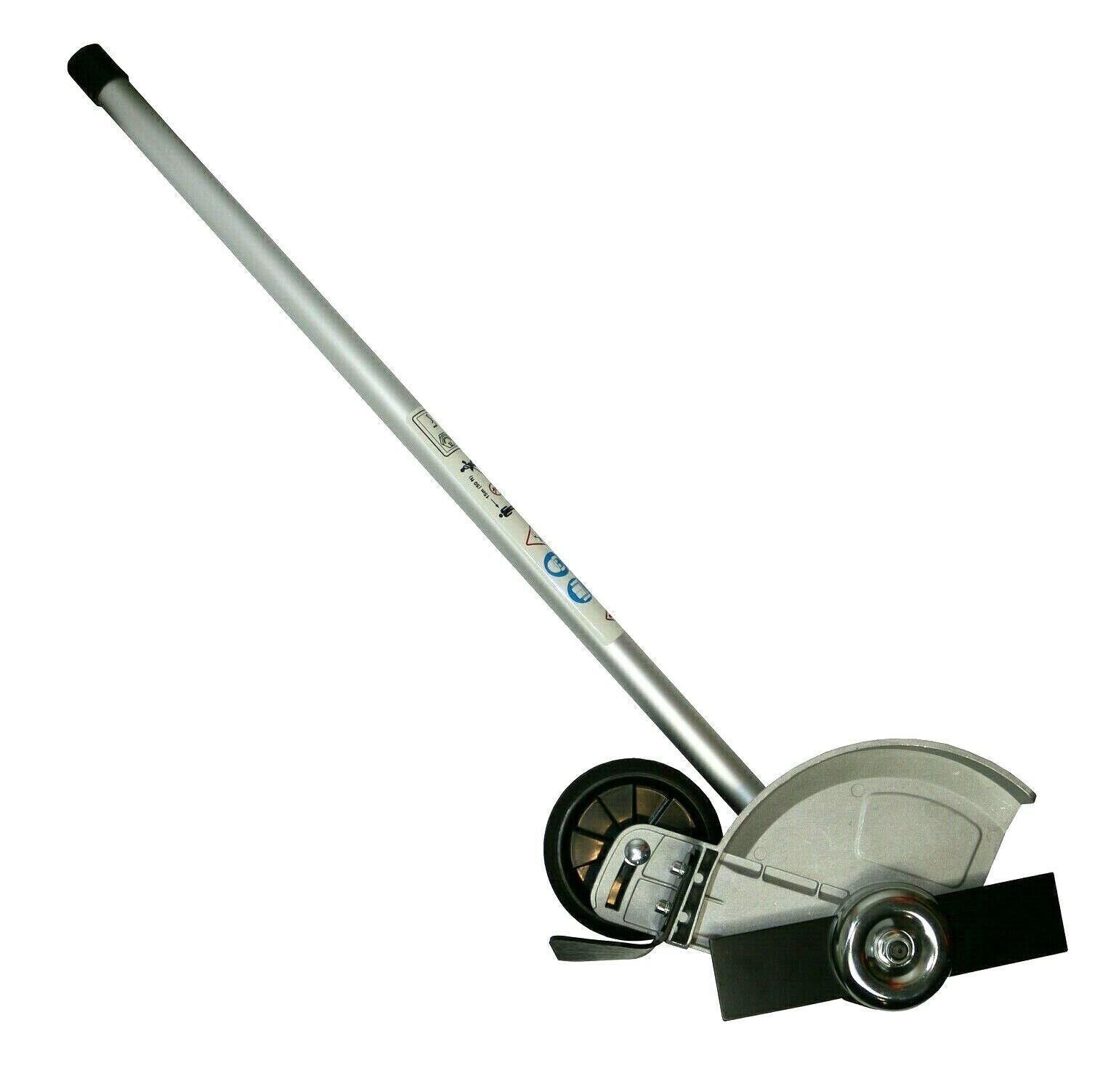-Equipped with a rubber guard, guide wheel & bar style edger blade.