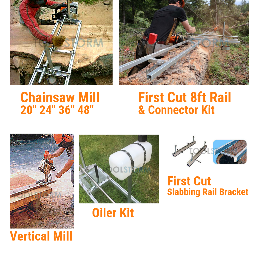 DescriptionChoose from our options: Vertical Mill system, Chainsaw Mill 20", Chainsaw Mill 24", Chainsaw Mill 36", Chainsaw Mill 48", First Cut 8ft Rail, First Cut 10 Ff rail, First Cut Bracket, Oiler Kit. -----Chainsaw Mill Description: Chainsaw Mill 20", 24", 36", 48" This chainsaw mill will convert your chainsaw into a portable mill/slabbing machine! Simply clamp your chainsaw bar to the milling attachment and you now have your very own portable saw mill. Light but sturdy, this mill is designed to produce smooth-cut slabs from your logs and trees. It is made of heavy duty aluminium components and also includes a protective plate made of perspex. This tool has a parallel bar that can have it's distance adjusted from the chainsaw bar to provide different thickness slabs. The first slab is cut by using a couple of guide rails placed and secured onto the top of the log. Notice: Includes instruction manual and operation guide detailing assembly of mill and how to use it, with pictures. Feature Protective perspex plate to guard against injury Strong clamp to hold weight of all brand name chainsaws