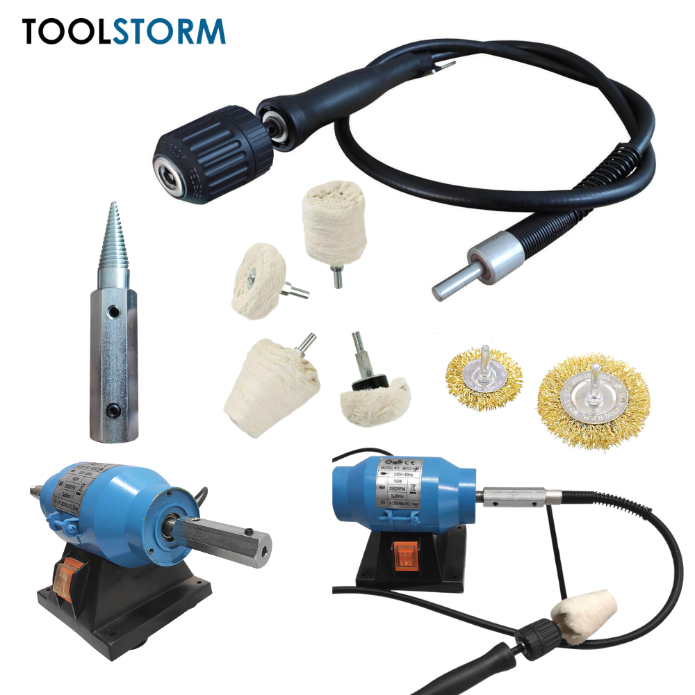 This great quality TOOLSTORM 1/2" 12.7mm right hand bench grinder metal polishing spindle adapter converts your 6" bench grinder into a metal polishing machine and is used for attaching metal polishing and buffing wheels up to 6" diameter (150mm). The new and improved right hand spindle adapter comes in two sections and now includes a tapered mandrel which you can attach to a drill and a flexi drive adapter which can be used to attach a TOOLSTORM Flexi Drive to your bench grinder.